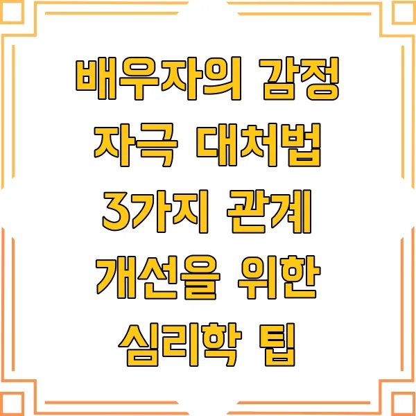 배우자와의 관계! 정말 소중하지만, 때론 지뢰밭 같지 않나요? 서로의 감정적 방아쇠를 잘못 건드렸다간… 💣💥 하지만 걱정 마세요! 심리학적 접근을 통해 관계를 개선하는 효과적인 대처법 3가지를 소개합니다. 갈등 해결 및 관계 개선을 위한 핵심 키워드는 바로 '인지적 재평가', '감정 라벨링', 그리고 '책임감 있는 소통'입니다. 이 세 가지 팁을 통해 배우자와의 관계를 더욱 돈독하게 만들어 보세요!
